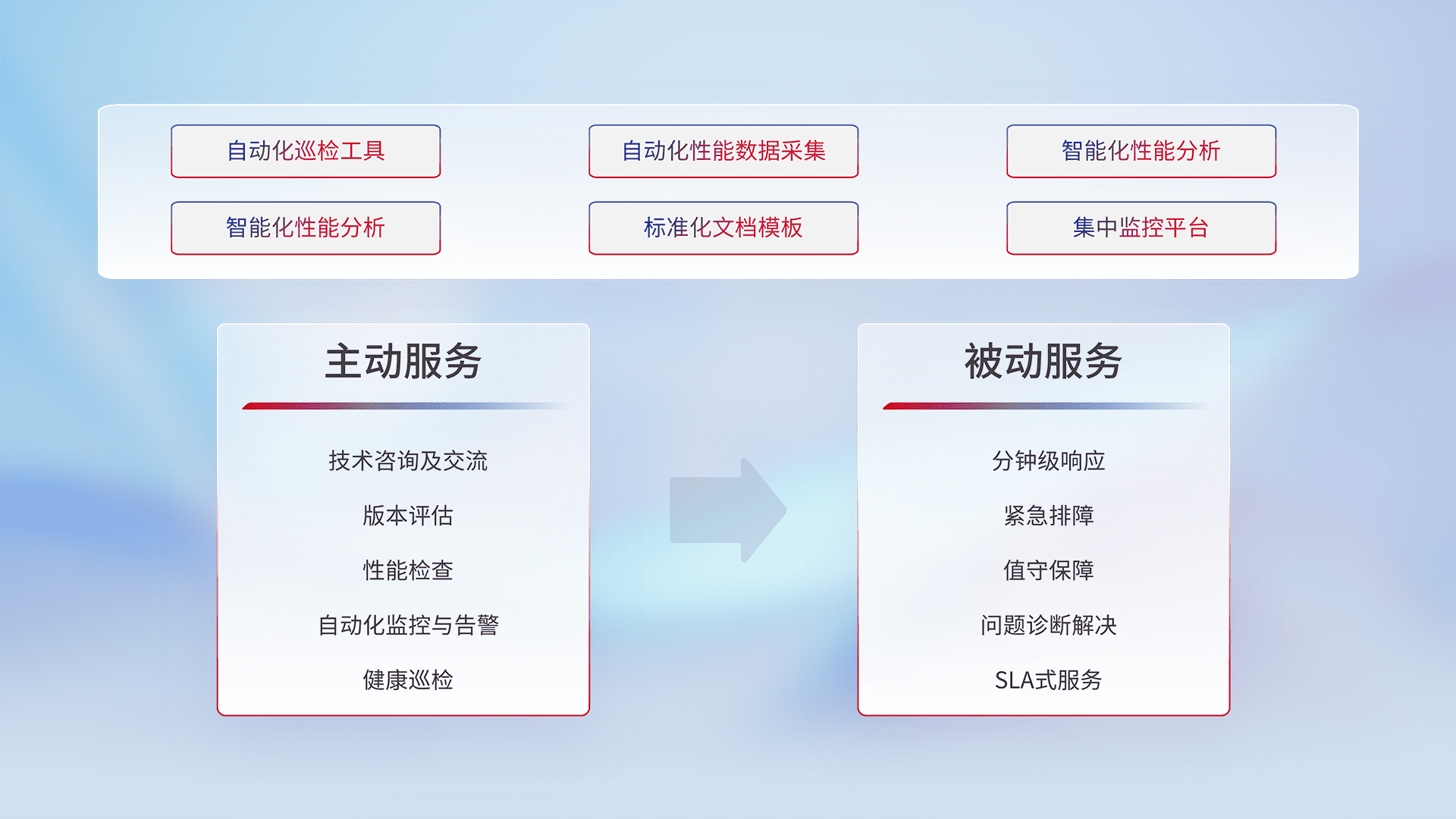 智能化工具和标准化文档,,,,保障服务质量,,,,提供主动服务(包含技术咨询、、、版本评估、、性能检查、、、、自动化监控与告警、、、、健康巡检)和被动服务包含(分钟级响应、、紧急排障、、、、值守保障、、、问题诊断解决、、、、SLA服务)。。